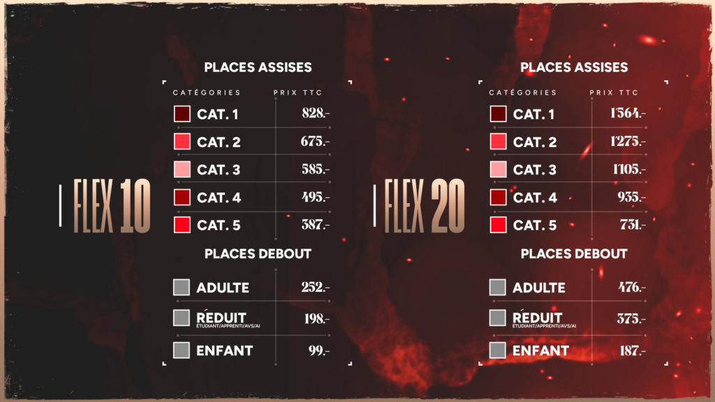L’offre Flex 10 / Flex 20 est disponible pour les catégories 1 à 5 de la Vaudoise aréna, ainsi que pour le secteur debout.